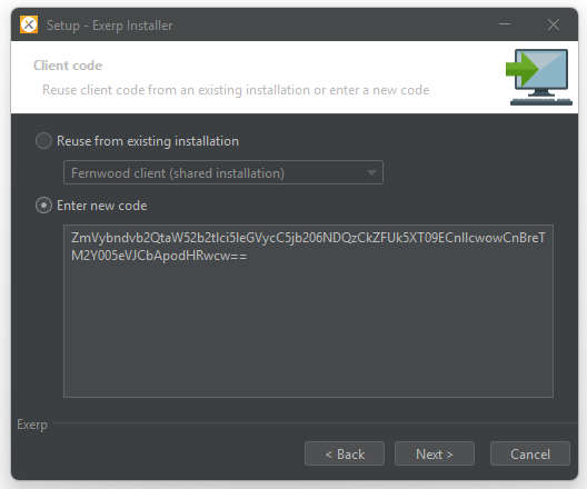 Click on Next and select Enter new code. Fill out the code Fernwood Support gave you: